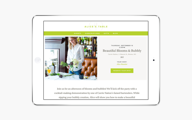 Alice wanted her brand to embody a quiet, luxurious ease so we developed a sophisticated yet approachable look and feel, then extended those traits to the site's messaging. Alice’s voice — joyful, friendly, and welcoming — comes through in every piece of content, from event descriptions and employee bios to headlines and the company mission statement.